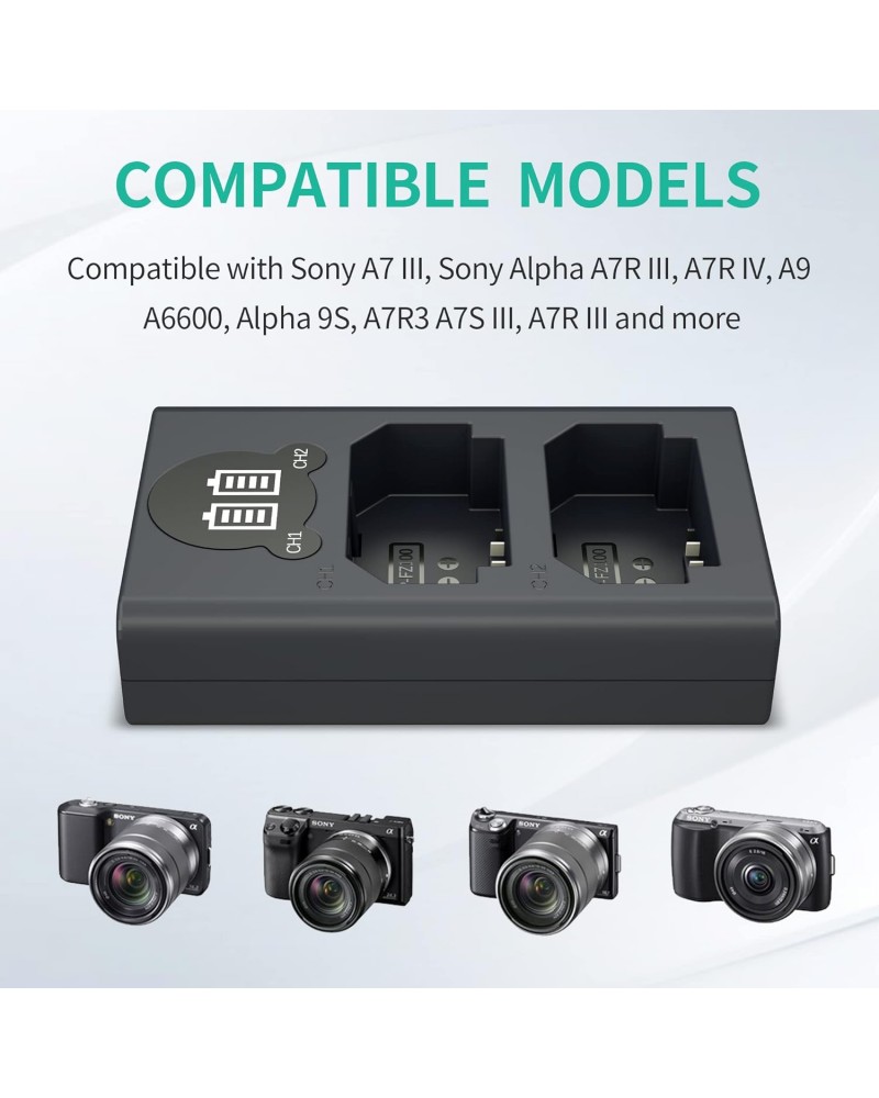 The SmallRig NP-FZ100 Camera Battery Charger accommodates two batteries of the same size as the original camera battery for simultaneous charging. It's compatible with a wide number of Sony mirrorless cameras. It can be used to charge the SmallRig NP-FZ100 camera battery as well as the original battery. The charger has a built-in USB-A charging cable as well as a USB-C input interface for use with a variety of power supplies. An LCD display gives real-time readings of the charger's current, voltage, capacity, and the battery's charging progress.