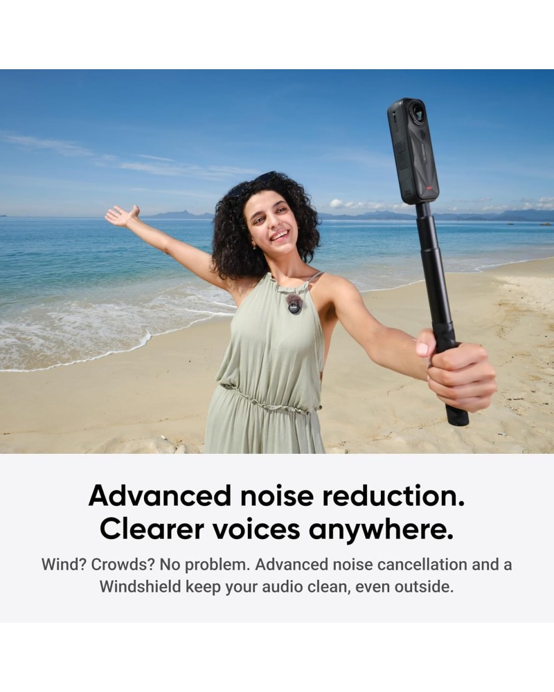 The Mic Air receiver can not only connect directly with the X5, Ace Pro 2, it can also be used with the Flow Pro 2, Flow Pro, and Flow cameras, as well as nearly any smartphone thanks to the universal USB-C connector. The Mic Air system features high-quality 24-bit / 48 kHz audio and integrated noise reduction for crystal-clear sound and fully intelligible speech. The 10-hour battery life supports all-day content creation. The transmitter supports a diversity of wearing methods, including magnetic, clip, and pendant-based wearing. You can trigger numerous functions directly from the Mic Air transmitter, including triggering video recording with your X5 or Ace Pro 2, noise-canceling functions, and mute. The Mic Air Kit includes one transmitter/mic, one USB-C receiver, a charging base to USB-A cable, a button magnet, a magnet pendant, a clip magnet, a windshield, and a carrying case.