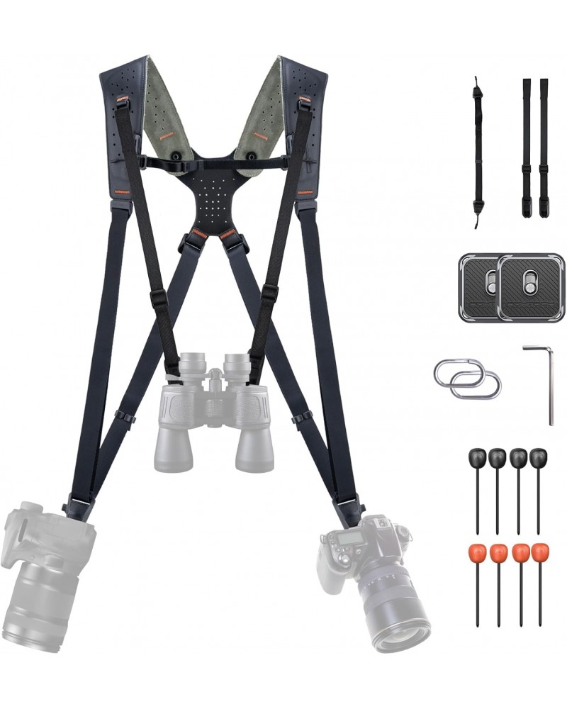 Comfortably carry up to three cameras simultaneously with this Camera Strap Master from PGYTECH. It offers maximum productivity while capturing wildlife, weddings, or events. The strap lengths are adjustable and it has an autofit shoulder system to ensure the perfect fit. The quick bead connectors provide secure and quick attachment and detachment of your cameras. Simply press the upper part of the quick connector to unlock the beads. The loops on the quick connectors are made from three layers of woven fabric, including an inner layer that shows you when it's time to replace your loops. The loops are abrasion resistant and made from UHMWPE, a thermoplastic polyethylene that is ten times stronger than steel wire and able to support 198 lb. This harness is made with resilient EPDM padding and has 115 ventilation holes for breathability and comfort.