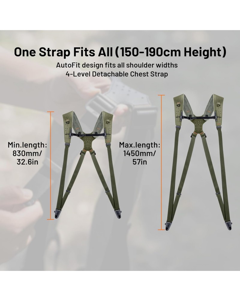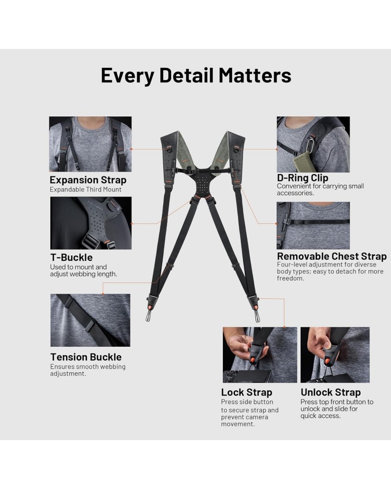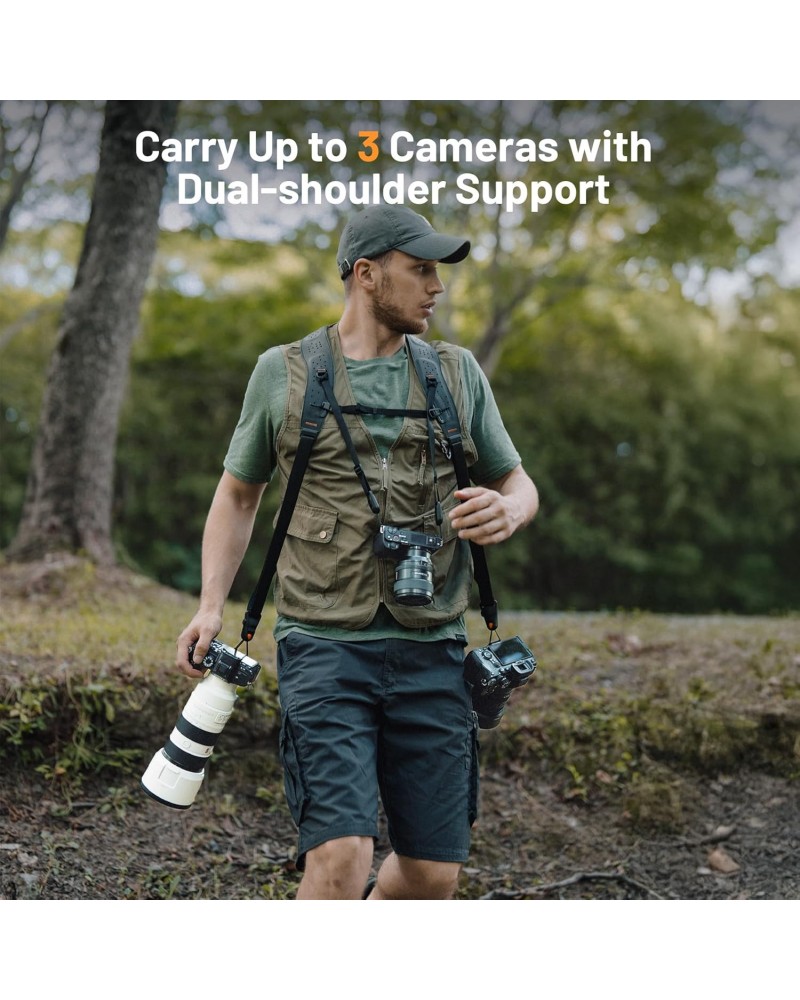 Comfortably carry up to three cameras simultaneously with this Camera Strap Master from PGYTECH. It offers maximum productivity while capturing wildlife, weddings, or events. The strap lengths are adjustable and it has an autofit shoulder system to ensure the perfect fit. The quick bead connectors provide secure and quick attachment and detachment of your cameras. Simply press the upper part of the quick connector to unlock the beads. The loops on the quick connectors are made from three layers of woven fabric, including an inner layer that shows you when it's time to replace your loops. The loops are abrasion resistant and made from UHMWPE, a thermoplastic polyethylene that is ten times stronger than steel wire and able to support 198 lb. This harness is made with resilient EPDM padding and has 115 ventilation holes for breathability and comfort.
