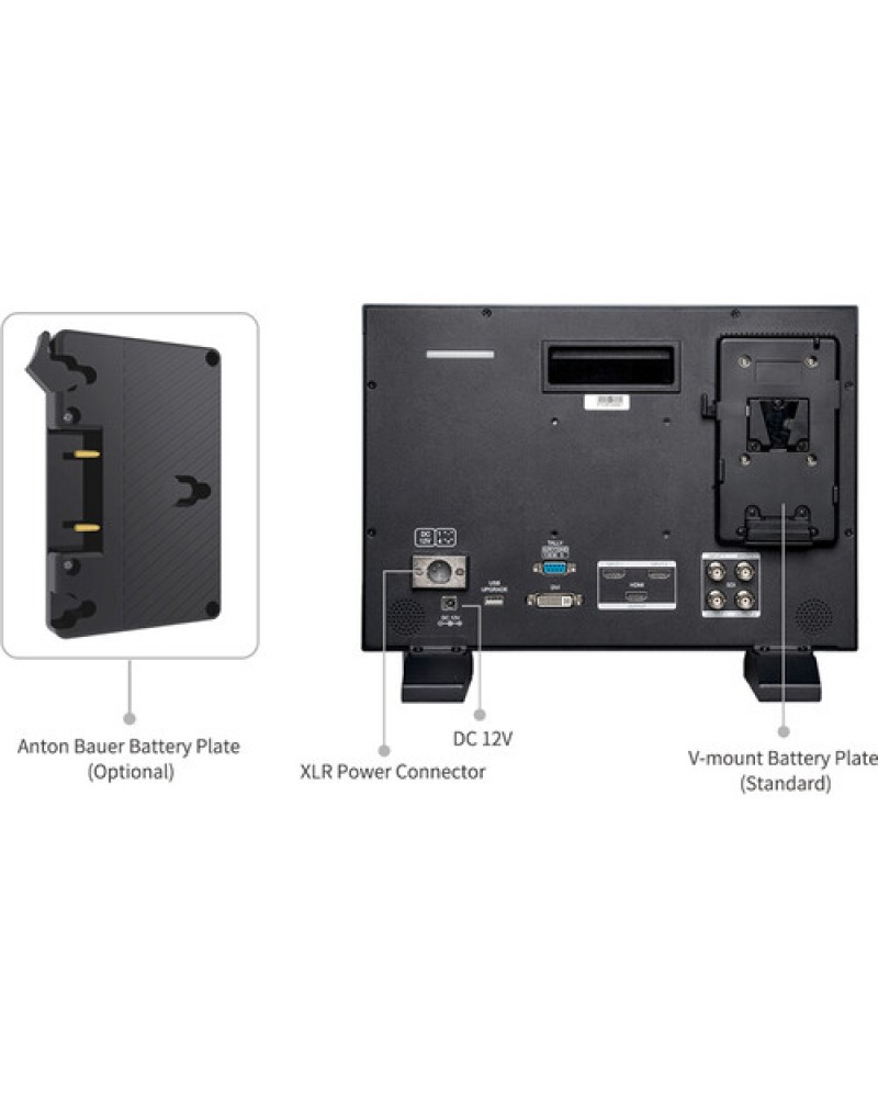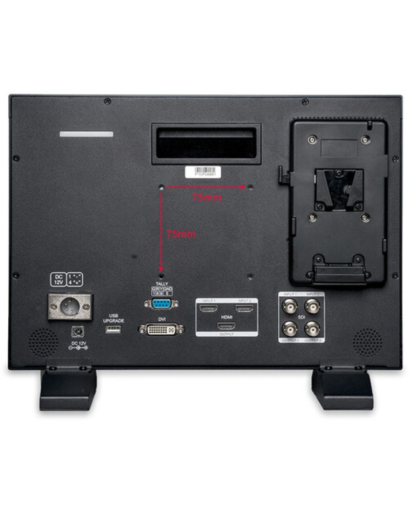 The display features two HDMI and two 3G-SDI inputs, one HDMI and two SDI outputs, and a DVI input for HD/SD video. A tally input on the back allows you to utilize the front and rear tally LEDs. A 3.5mm analog audio output provides speaker output, and there are two built-in speakers on the front. A USB-A input on the back allows you to load custom LUTs for live cine LUT monitoring.