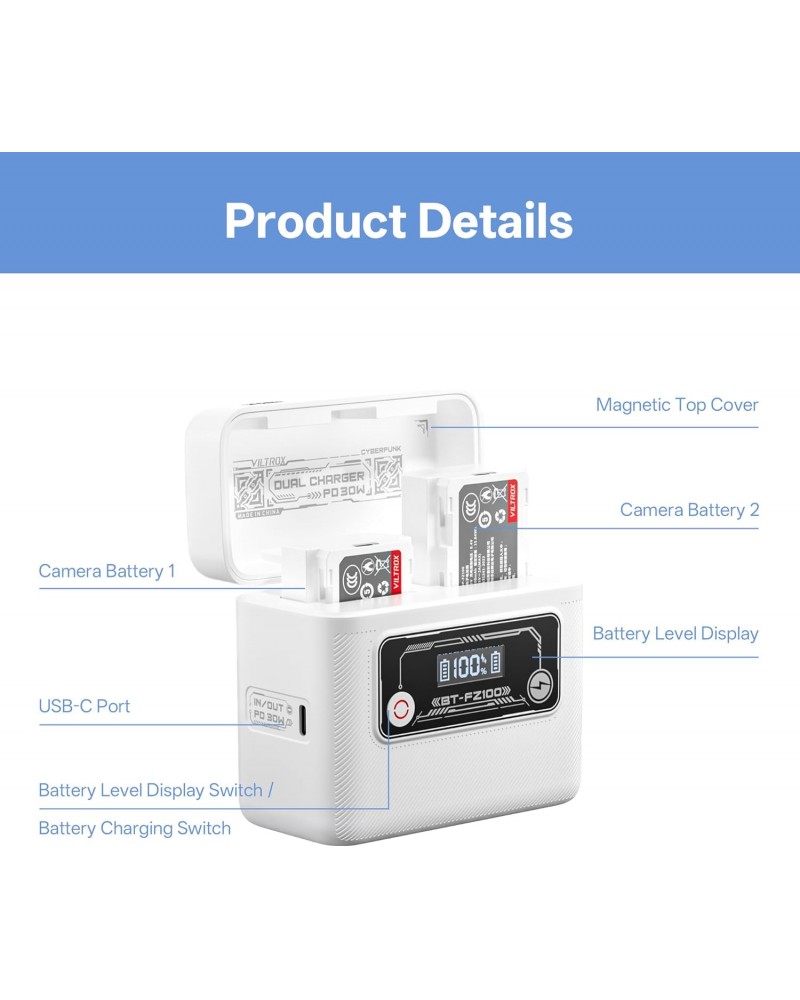 Use the Viltrox BT-FZ100 Camera Battery Charging Case Power Bank for Sony NP-FZ100 to charge your batteries quickly with USB-C PD 30W fast charging, fully charging the case in just 80 minutes for ultimate convenience. The Viltrox BT-FZ100 is lightweight, stylish, and travel-friendly, with a premium storage pouch included to keep your charging case safe from scratches.