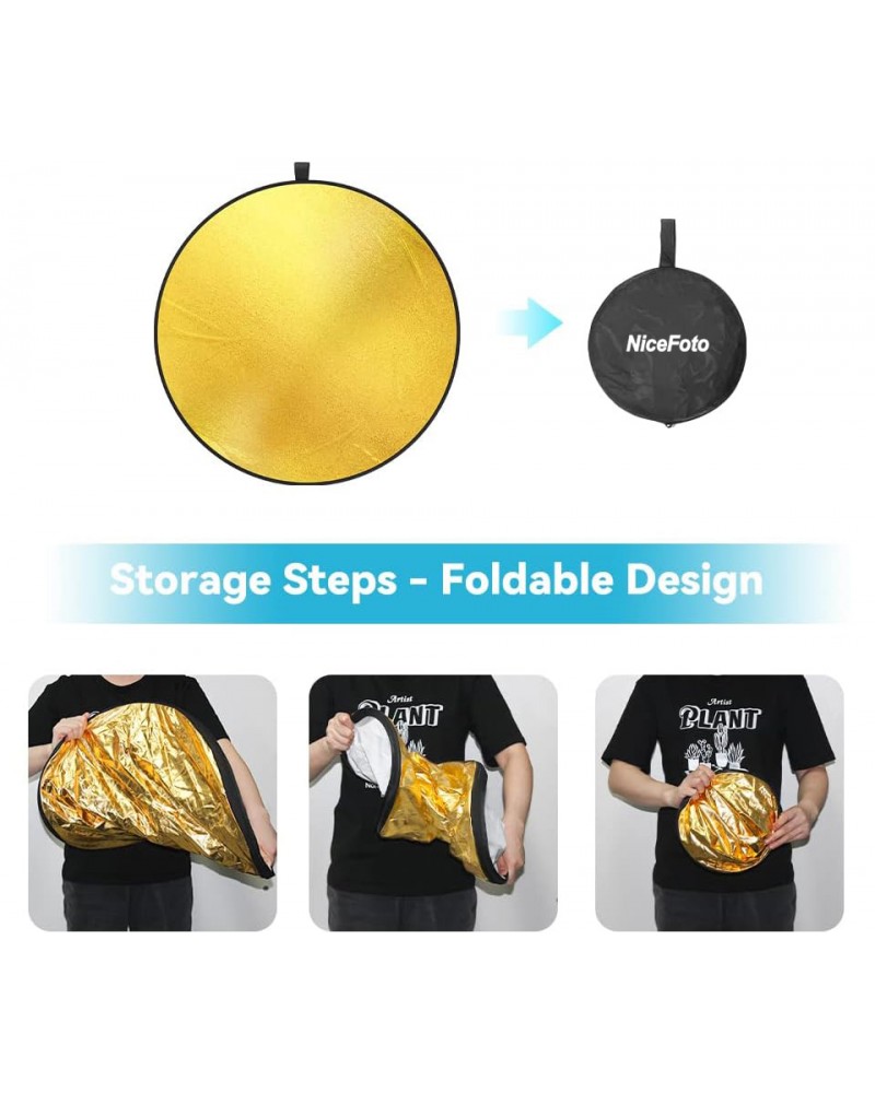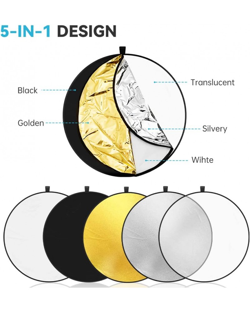 The NiceFoto SR-5-Ø22" (56cm) 5-in-1 Round Reflector Disc is a collapsible photography accessory designed to control and modify light. It includes five surfaces—gold, silver, white, black, and translucent—making it versatile for both studio and outdoor shooting.