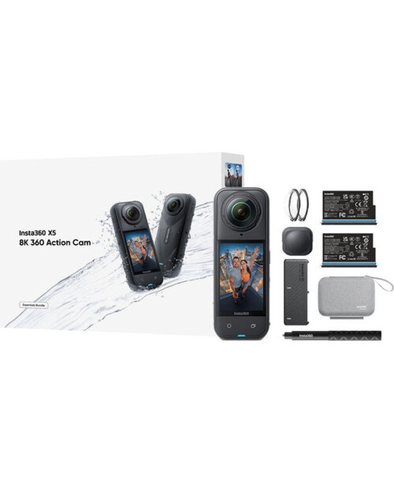 Upgrade your production to cinematic 360° video with the powerful Insta360 X5 360 Action Camera Essentials Bundle. This bundle includes the X5 camera, lens guards, two batteries, a lens cap, a carry case, a fast-charge case, and a 3.7' Invisible Selfie Stick. The X5 is capable of capturing HDR 8K30 360° PureVideo in dual or single-lens modes, all in one portable action camera. The X5 offers an action-ready design with AI-powered software for an intuitive approach to creating dynamic content in any environment, as well as "Bullet Time" capture, 180 Mb/s bit rates, time shift, loop recording, and time-lapse. The X5 also has an updated rugged design, is natively waterproof up to 49', and has an upgraded rechargeable 2400mAh battery for an increased runtime of up to 88 minutes.
