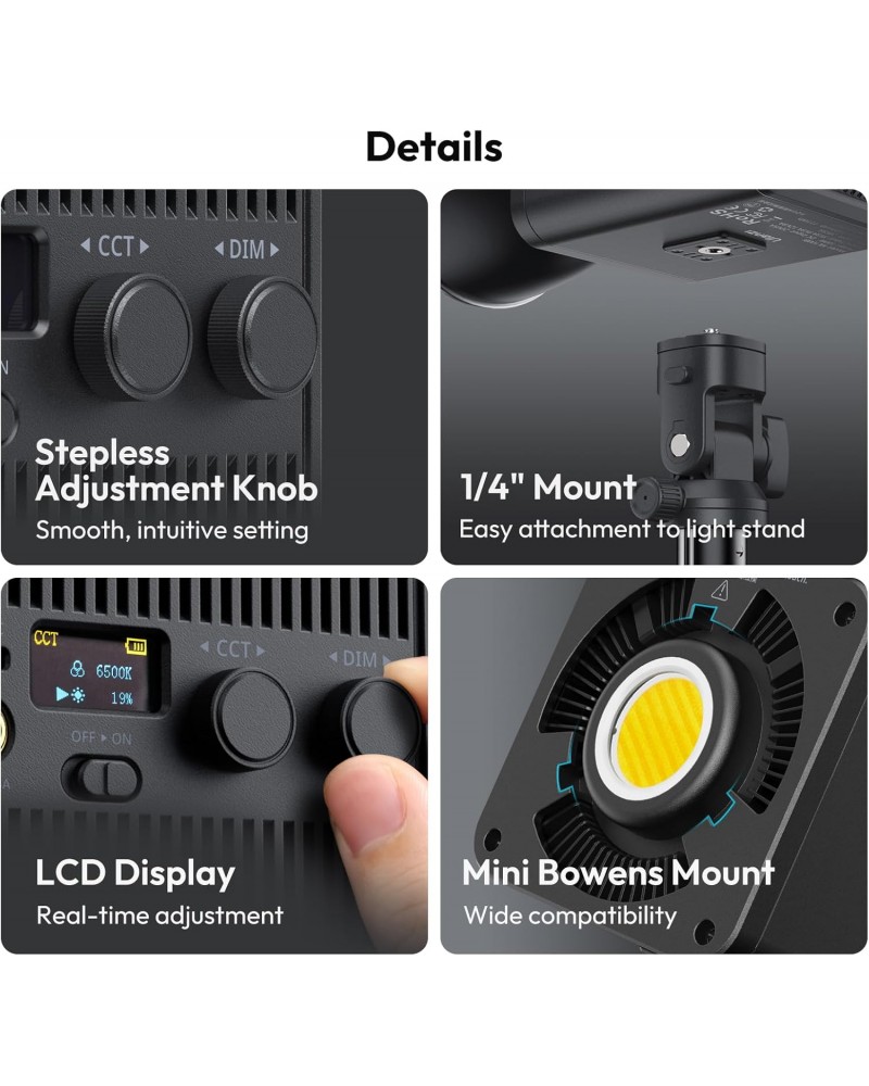 Real-time adjustments via LCD display and wide compatibility with Mini Bowens mount for seamless integration with various accessories.