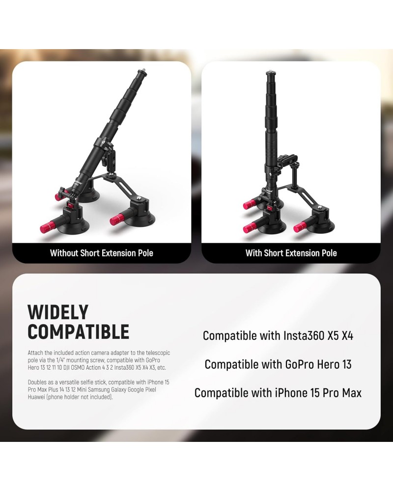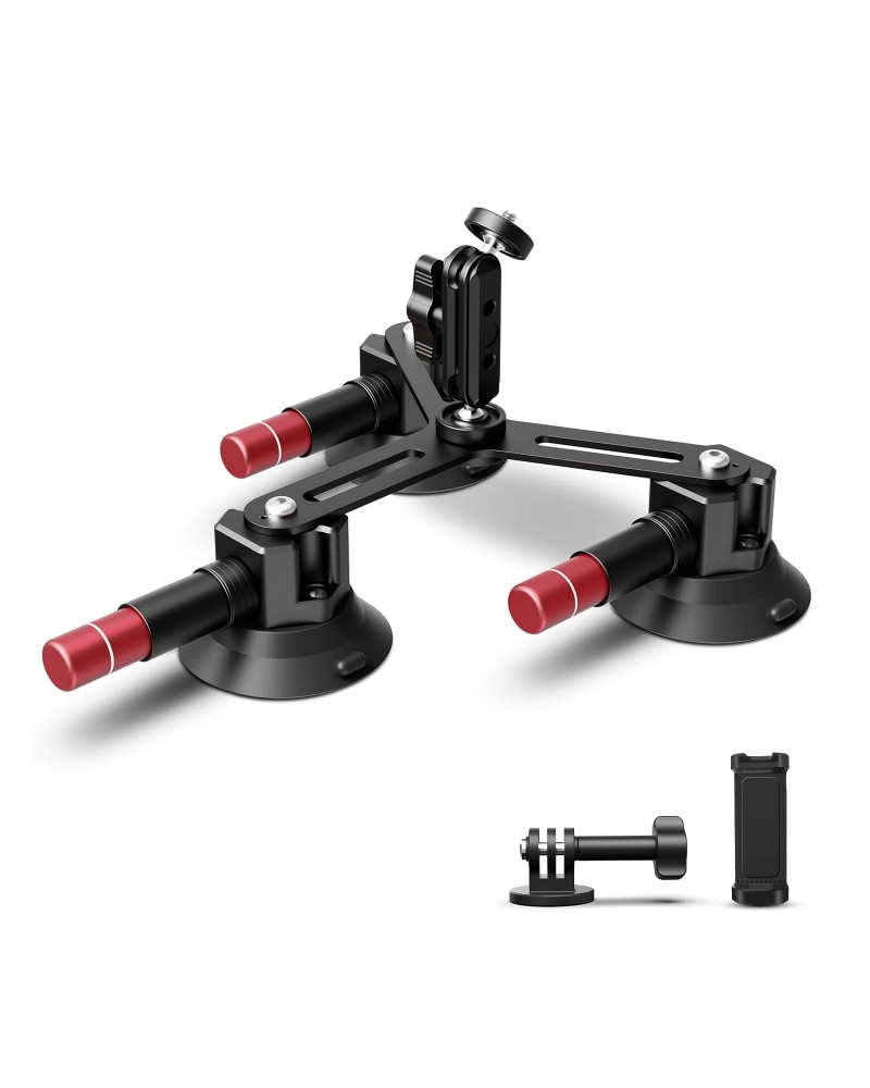 Triple Suction Cup Car Mount Kit- Capture unique driving angles from your engine hood, windshield, or car side for immersive footage on the road. This triple suction cup camera mount securely attaches your phone or action camera with three powerful suction cups, and position it using the ball head magic arm for various shooting perspectives. Note to use at speeds below 80 km/h to prevent accidental drops