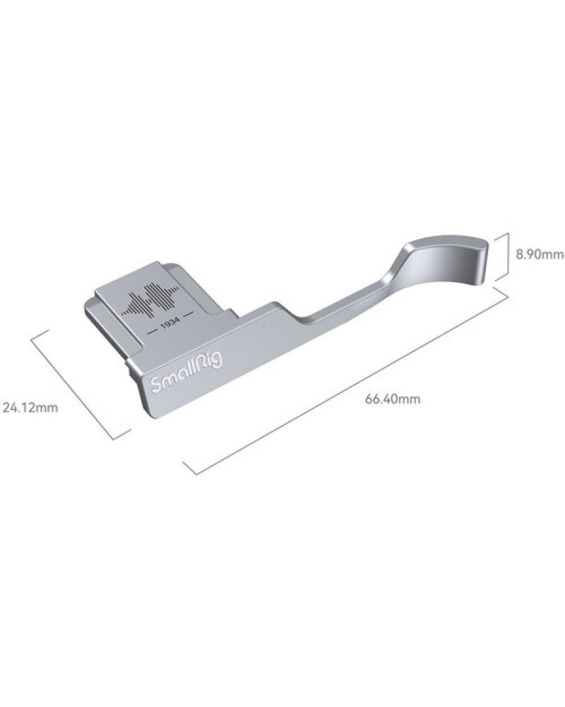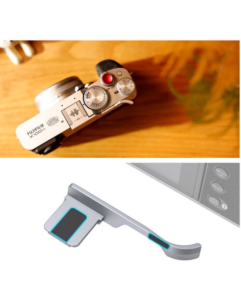 Shoot longer, and with added comfort and stability, using the silver SmallRig Thumb Grip for the FUJIFILM X100VI and X100V. It slides easily into the camera's hot shoe and provides a concave groove to improve safety and one-handed shooting. Engraved with the FUJIFILM sound wave and foundation year, the grip has built-in silicone pads to protect your camera body and hot shoe electronic components from dust, rust, and electronic shorts. It comes with a shutter release button to ensure a soft and comfortable finger touch.