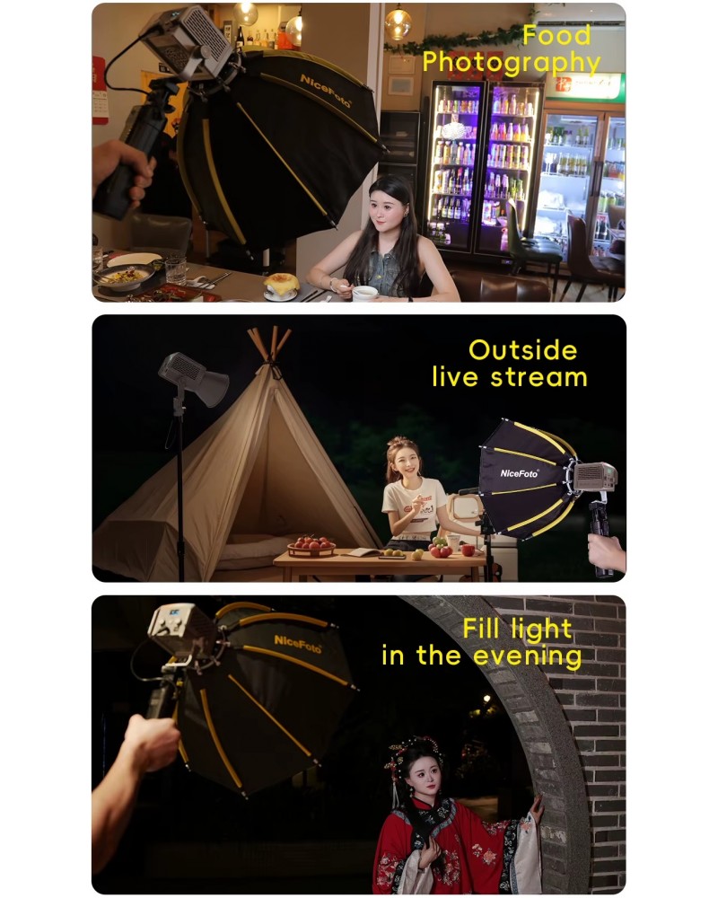 Compact COB Video Light: With a net weight of about 420g and a compact size of 10.8x9.3x8.4 cm, our COB video light boasts lightweight portability, making it ideal for both outdoor and indoor video recording, live streaming, as well as product and portrait photography.
