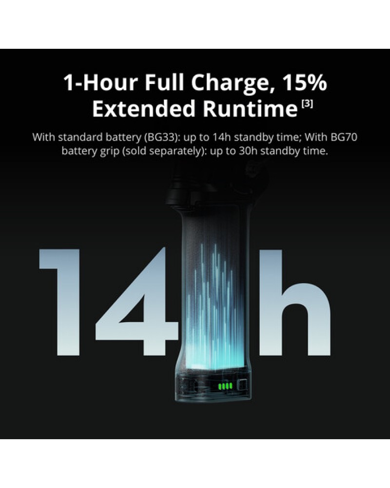 When used with the BG33 battery grip, the RS 5 gimbal can be fully charged in as little as one hour using a 65W PD power charger. It offers 14 hours of runtime, 15% more than the RS 4, or up to 30 hours when used with a BG70 battery grip.